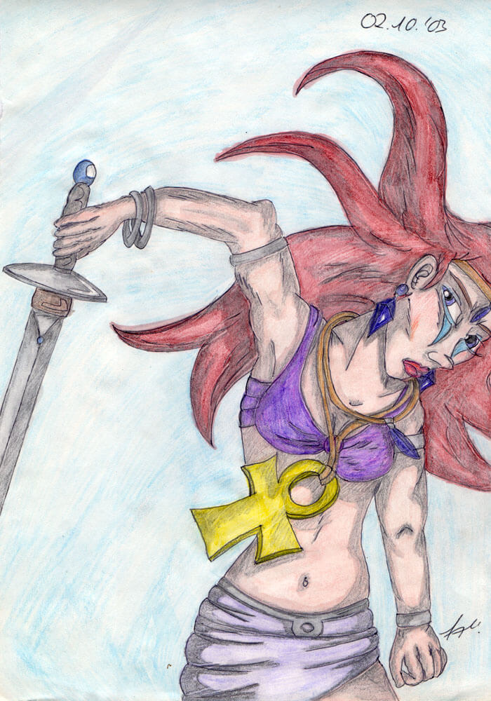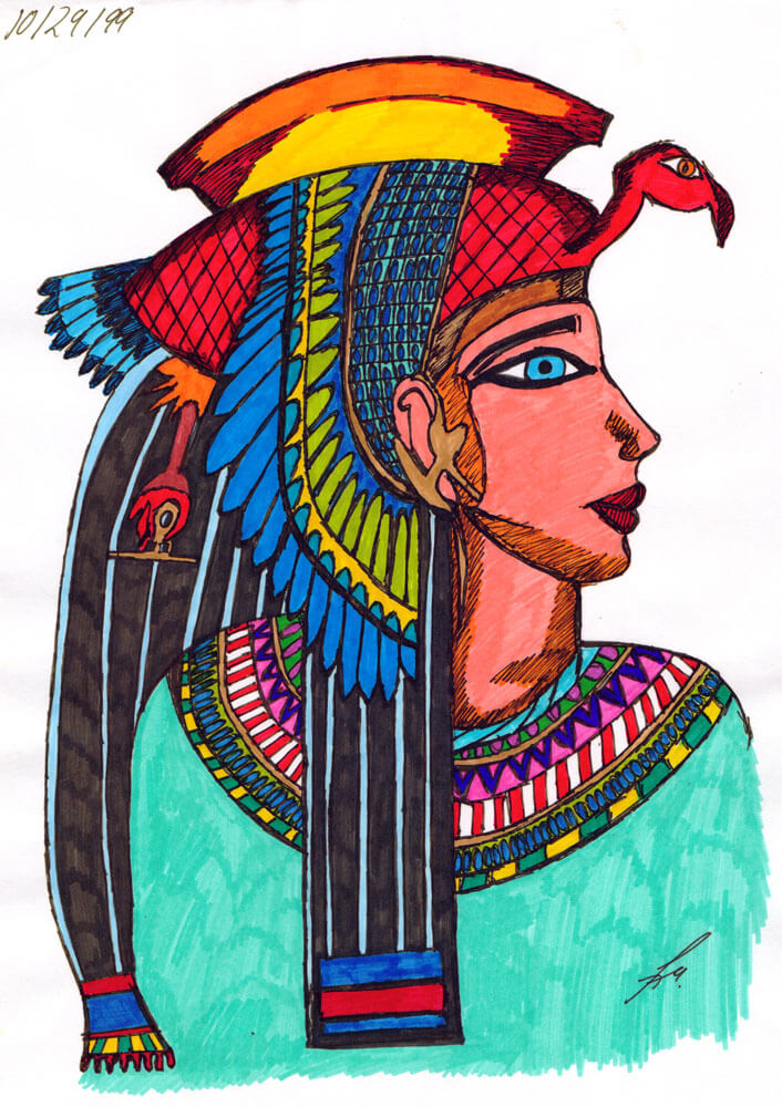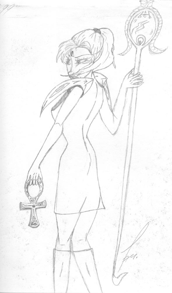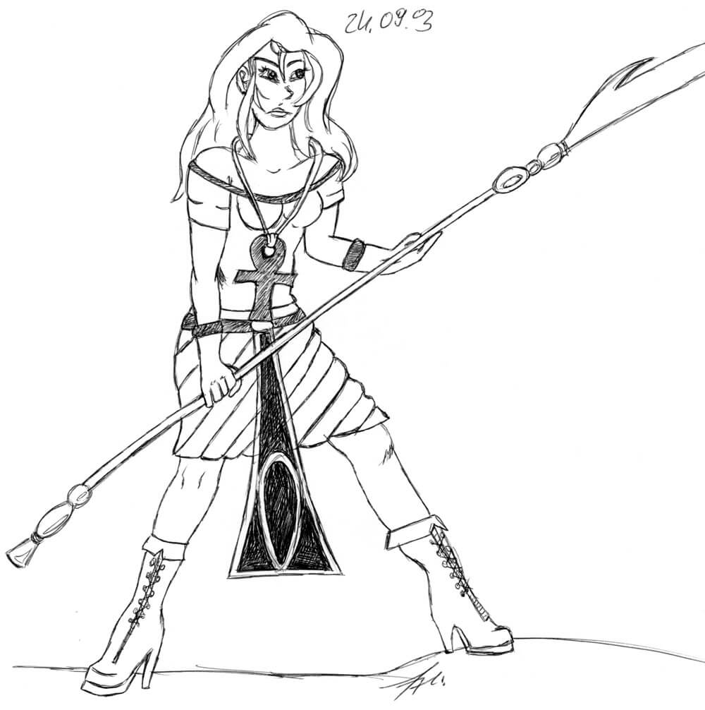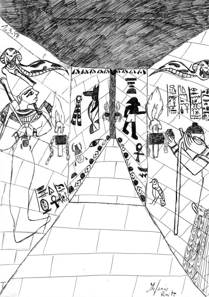 Das älteste Bild aus meiner Sammlung stammt aus dem Jahr 1996 und ist während eines Familienurlaubs in die USA mit Kugelschreiber auf Karopapier entstanden. Wie die meisten meiner Bilder, ist auch dieses komplett ohne Vorlage rein aus dem Kopf heraus entstanden und bildet eines meiner zeichnerischen Lieblingsthemen neben den Meerjungfrauen ab: Ägypten. 🙂