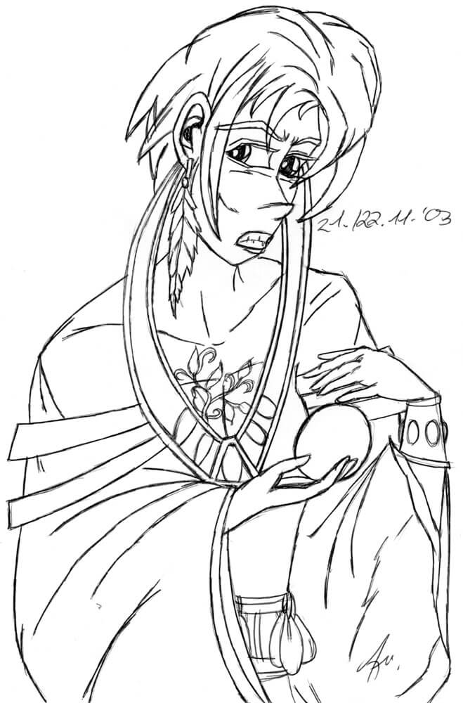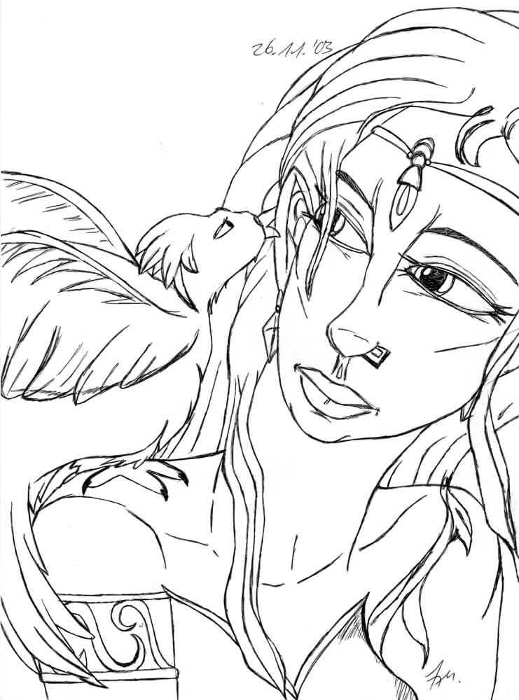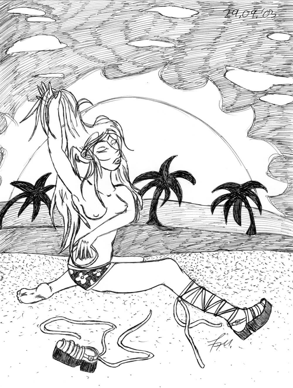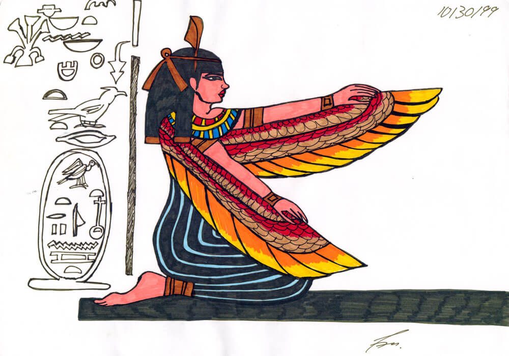 Das älteste Bild aus meiner Sammlung stammt aus dem Jahr 1996 und ist während eines Familienurlaubs in die USA mit Kugelschreiber auf Karopapier entstanden. Wie die meisten meiner Bilder, ist auch dieses komplett ohne Vorlage rein aus dem Kopf heraus entstanden und bildet eines meiner zeichnerischen Lieblingsthemen neben den Meerjungfrauen ab: Ägypten. 🙂