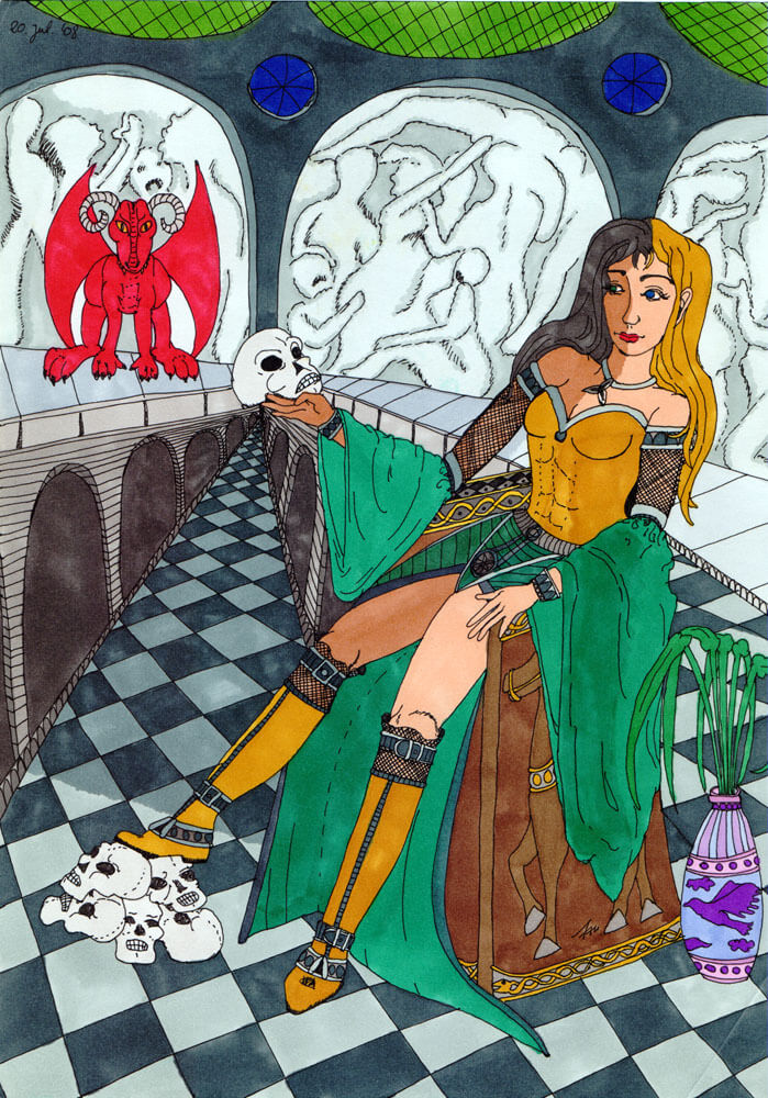 Die Bilder, die ich mit Layoutmarkern gemalt habe, nehmen von Jahr zu Jahr zu und somit auch meine Erfahrungen mit diesem Material. Ein Motiv, welches ich schon 2006 gezeichnet habe, habe ich zwei Jahre später noch einmal aufgegriffen und in einer farbigen Variante Hel in der Unterwelt gezeichnet. Es kam übrigens recht oft bei mir vor, dass ich in meinem Bilderarchiv gestöbert und alte Motive noch einmal aufgegriffen und neu interpretiert habe.