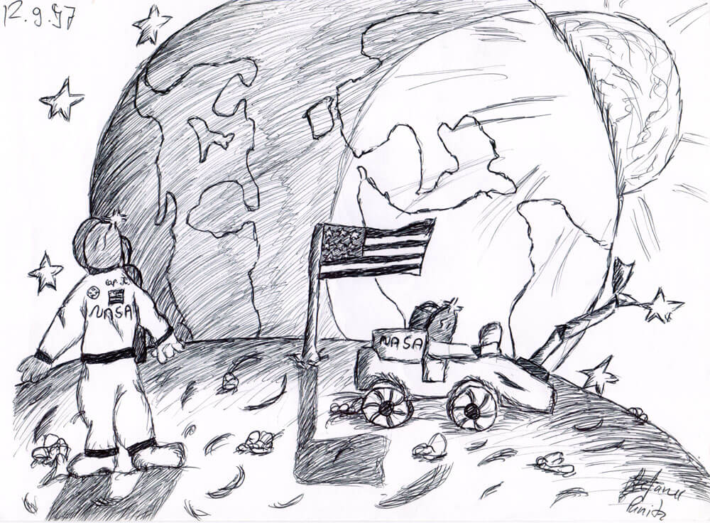 Für das Jahr 1997 habe ich auch zwei Beispiele aus meiner Schulzeit, die im Kunstunterricht mit Bleistift auf DIN A3 entstanden sind.