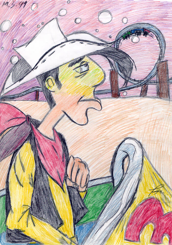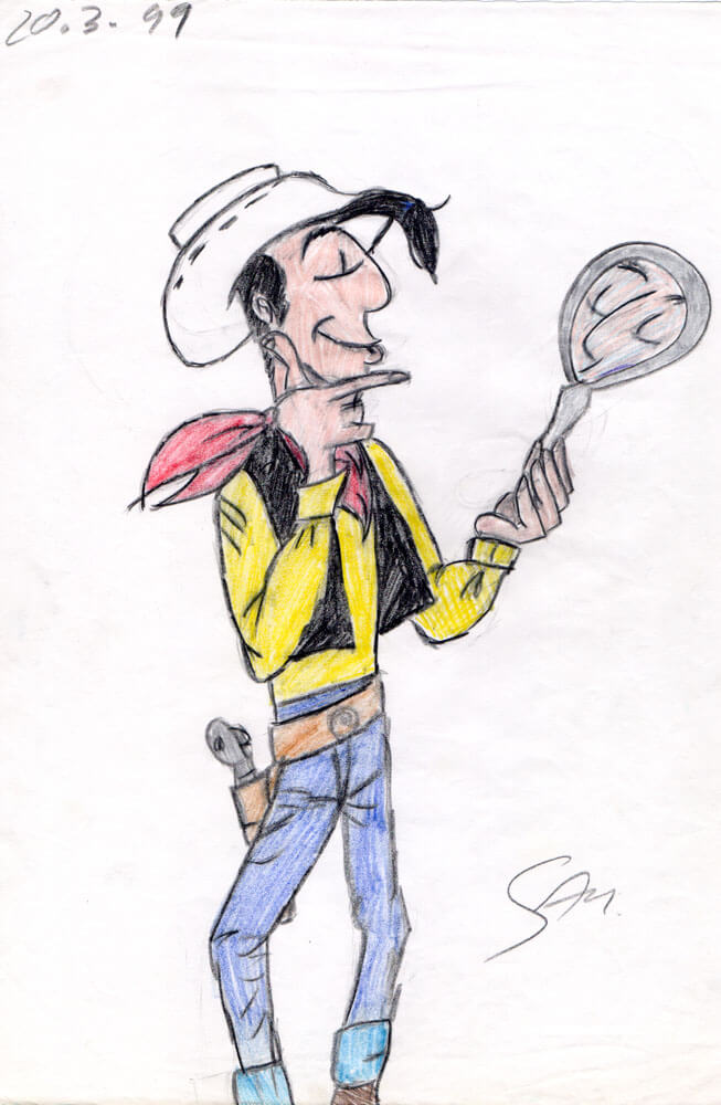 Außerdem hat mich Lucky Luke*, dessen Comics ich immer sehr gerne gelesen habe, zu einigen Interpretationen inspiriert. So habe ich ein Bild, in dem ihm vom vielen Essen schlecht geworden ist, auf eine Achterbahn übertragen. Auch ein Portrait meiner Mutter, welches anhand eines Fotos entstanden ist, ist in meiner Sammlung dabei. Wie bereits geschrieben, waren Fotovorlagen früher bei mir eine Seltenheit.
