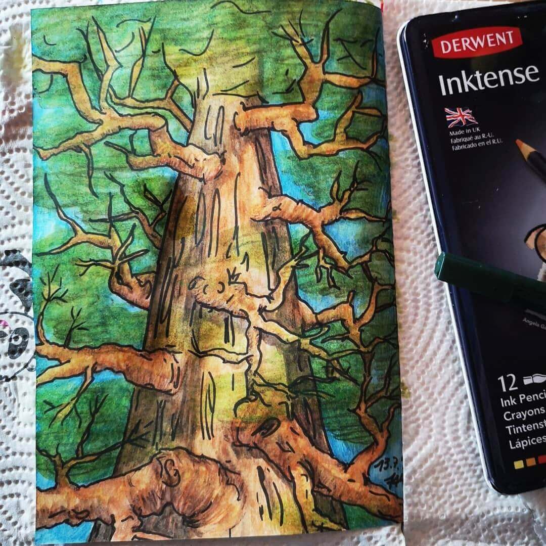 Für die folgenden Tage habe ich oben stehende Materialien je nach Bild und Laune immer wieder eingesetzt. Aber auch der Druckbleistift kam gelegentlich zum Einsatz. Koloriert habe ich auch viel mit den Marco Raffine Buntstiften*, die ich meinem Mann eigentlich für seine Ausmalbilder überlassen habe. Die Buntstifte haben eine angenehme weiche Mine und einen satten Farbauftrag.