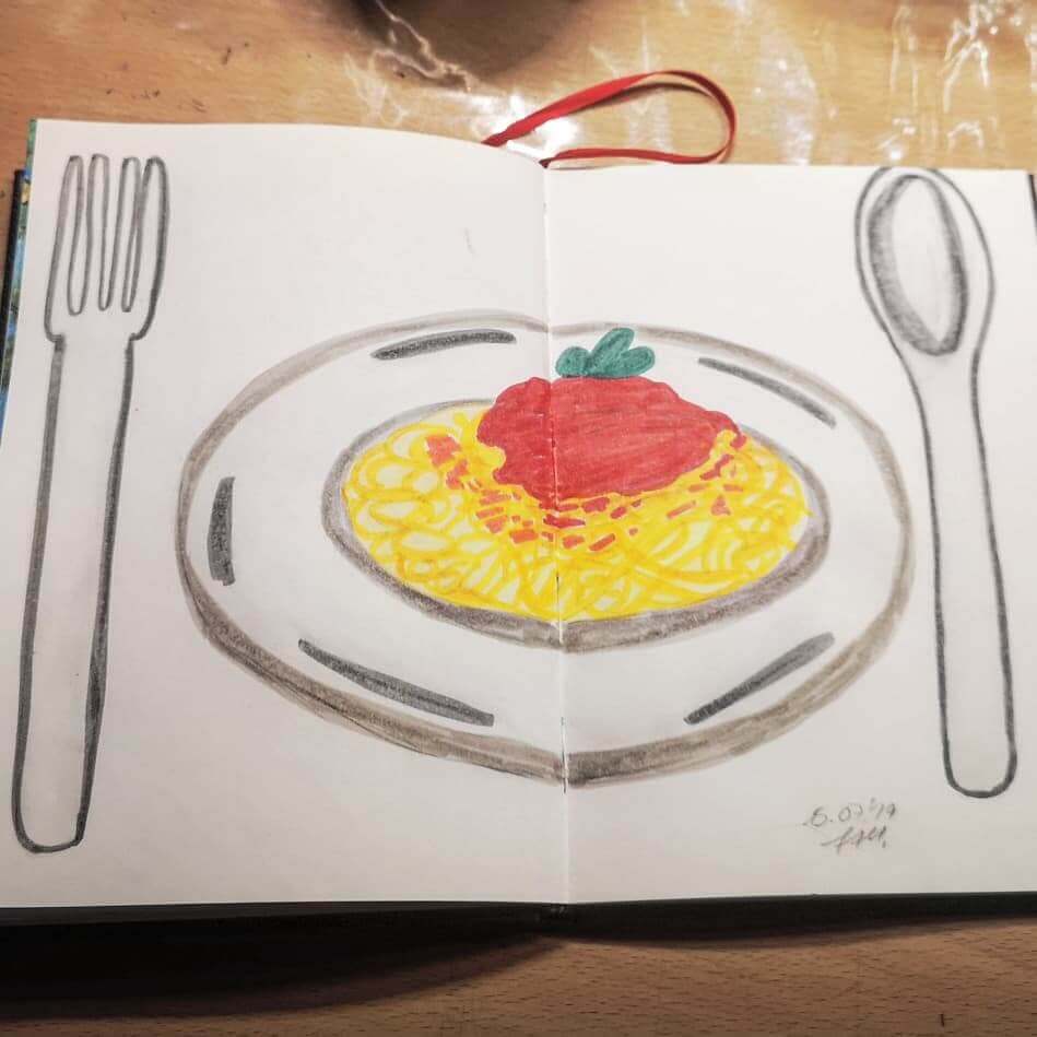 Die Frau, die zwei Masken in den Händen hält, ist mir zeichnerisch leider nicht so gut gelungen, wie vorgestellt. Mein Posting. - Tag 15 – Lieblingsessen