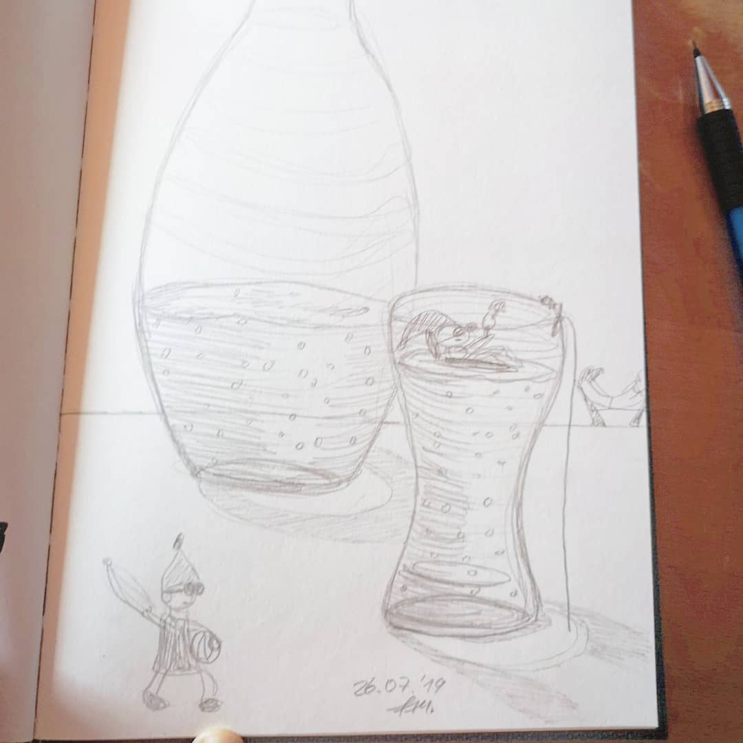 Es war wieder heiß, sehr heiß. Heinzelmännchen brauchen auch mal eine Abkühlung, die haben sie sich dann in meinem Wasserglas geholt. Mein Posting. - Tag 27 – Bösewicht im Urlaub