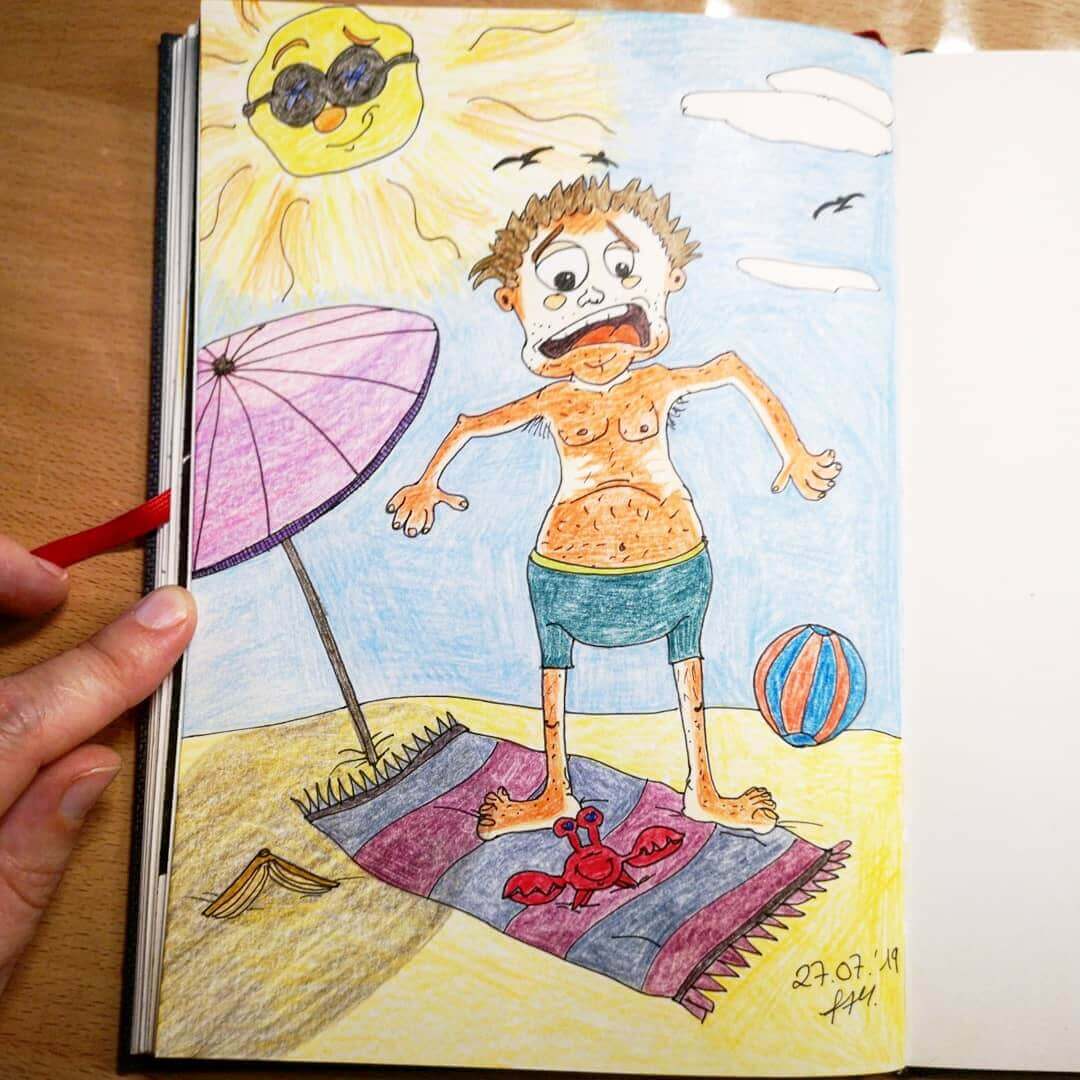 Ich habe den Bösewicht jetzt nicht selbst gemalt, sondern eine böse Situation, die einen im Urlaub ereilen kann – nämlich einen Sonnenbrand. Mein Posting. - Tag 28 – Fantasiewesen