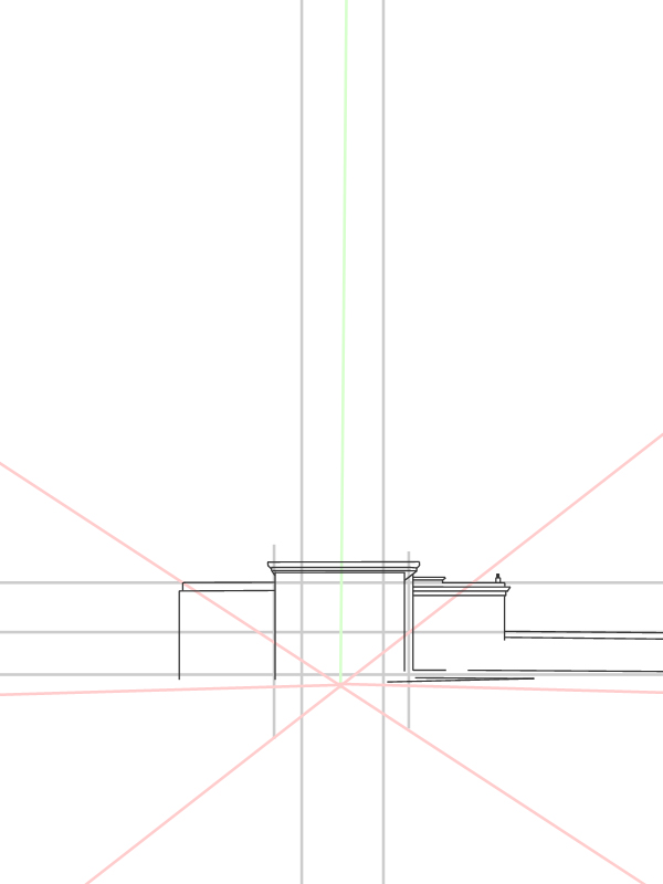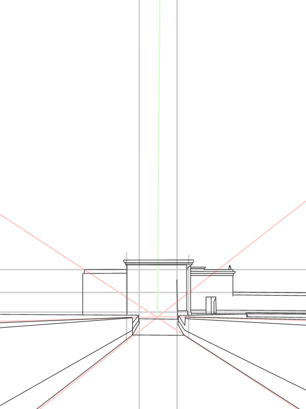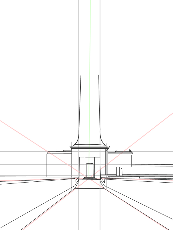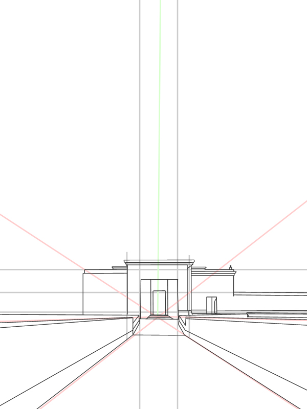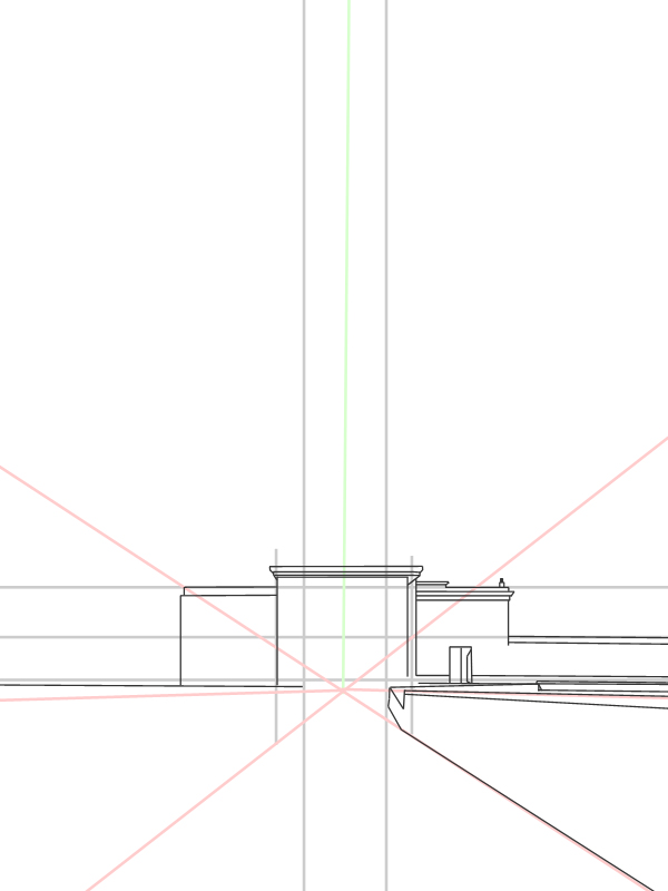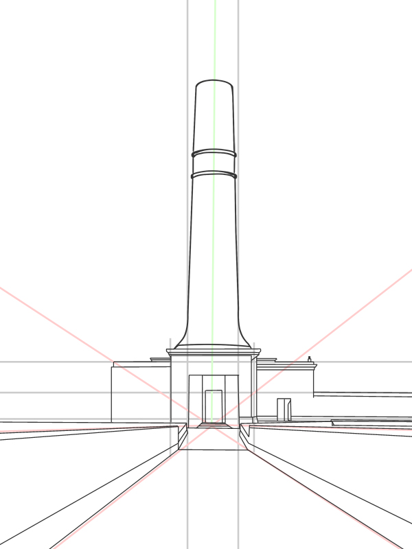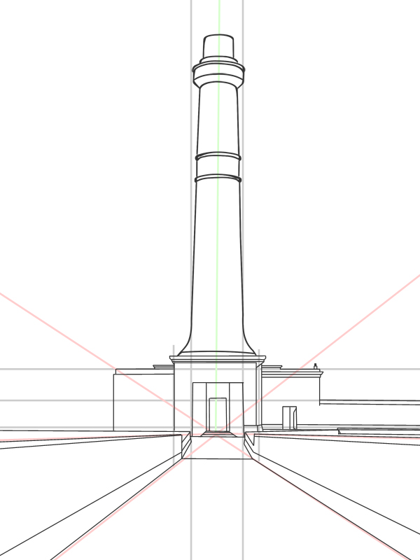 Verdeutlicht werden die Fluchten durch Setzen mehrerer Hilfslinien. Die Horizontlinie (ebenfalls unter der Tür) bildet dabei einen soliden Grund. Der Fluchtpunkt liegt genau auf der Horizontlinie. Dies wird deutlich, sobald man die Linien der Mauern im Vordergrund weiter zeichnet. Vom Fluchtpunkt nach oben läuft eine vertikale Linie nach oben, welche die Mitte des Leuchtturms bildet, auf der auch die Fenster sitzen. Man sieht also: Das Bild ist sehr symmetrisch und strukturiert aufgebaut. Dies ist bei künstlichen Objekten sehr oft der Fall.