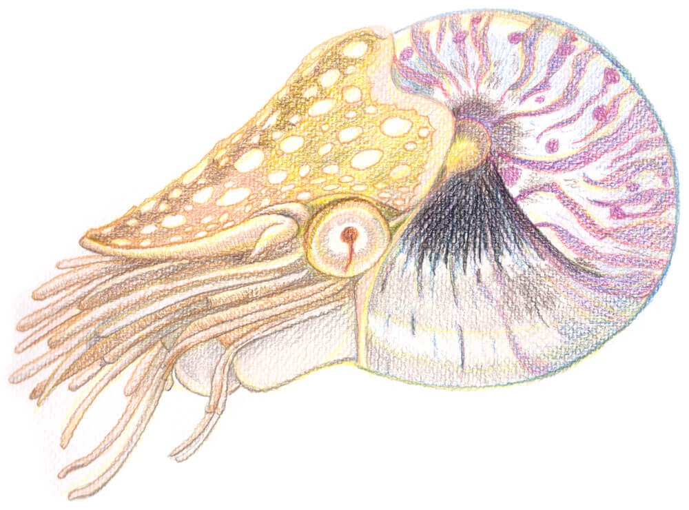 Zunächst habe ich die auffälligen Merkmale angedeutet und anschließend mit verschiedenen Farben kombiniert ausgearbeitet, so wie die Streifen am hinteren Teil des Perlboots (wie man diese Tiere auch noch nennt).