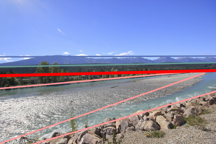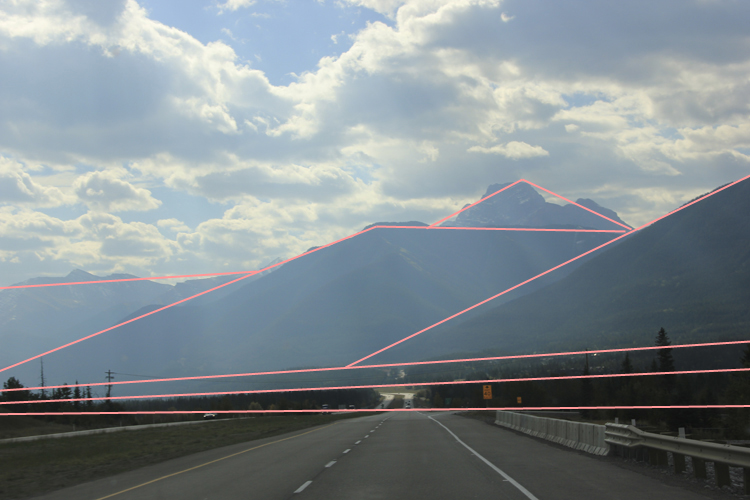 In diesen Beispielen liegen die Berge sehr weit entfernt, haben also einen ausgesprochen starken Blaustich. Auch hier gibt es unterschiedliche Abstufungen, welche mit den Hilfslinien erfasst wurden.