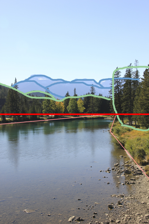 Mehrere Horizontlinien können mit Hilfslinien angedeutet und so die Landschaft eingeteilt werden. Dadurch können der Grad der Verbläuung und des geringen Kontrastes, also der Farbton, skizziert werden.